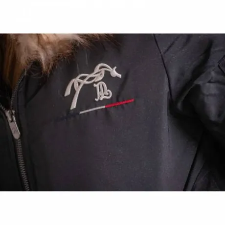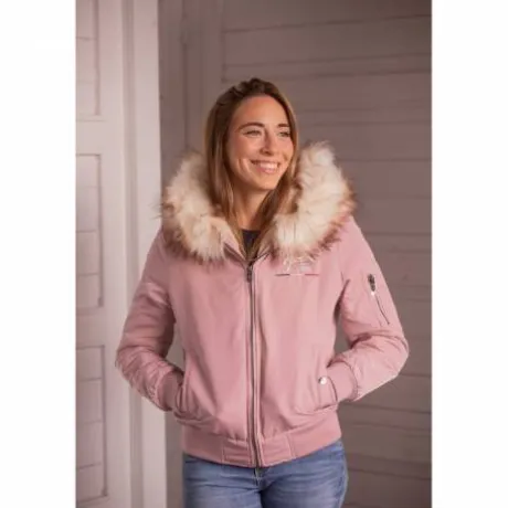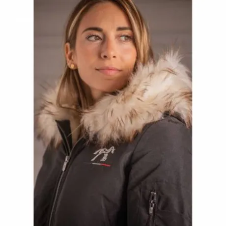 Équipé d’une fermeture éclair pratique, d’une capuche bordée de fausse fourrure pour une touche cosy, et de deux poches boutonnées à l’avant, ce modèle se distingue également par une poche zippée sur le bras gauche qui ajoute une note sportive et fonctionnelle. Le logo Pénélope côté cœur signe ce modèle d’une empreinte élégante et féminine.