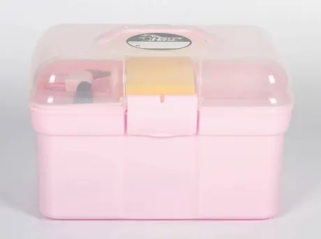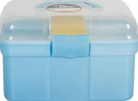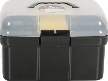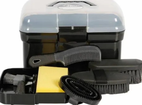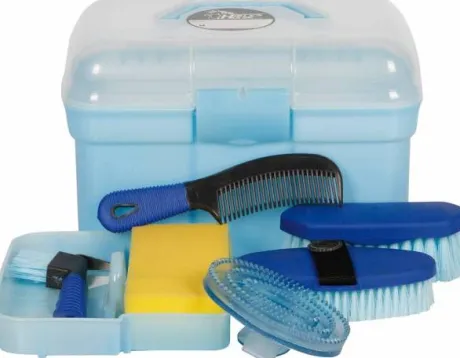 Boîte de pansage complète de la marque Harry’s Horse, avec plateau de rangement, équipé d’un cure-pied avec brosse, une brosse douce, une brosse dure, un peigne, une étrille et une éponge.