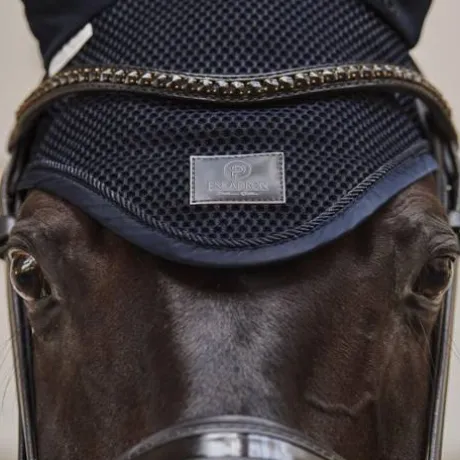 Bonnet anti-mouches Mesh de la collection Platinum 2022 de chez Eskadron dont l’avant est magnifique avec le blasson sur l’avant du bonnet et, un liseret en corde (ton sur ton).