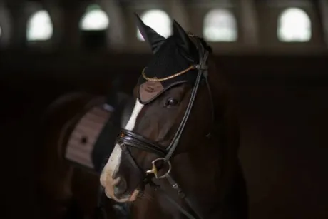Bonnet anti-mouches crocheté dans une belle couleur noir. Décoré d’un écusson en satin marron mocha sur le devant, une bordure noire et d’un badge Equestrian Stockholm en noir.