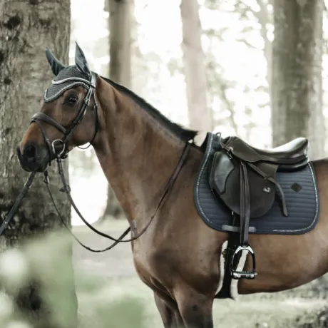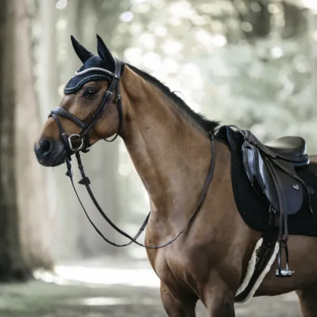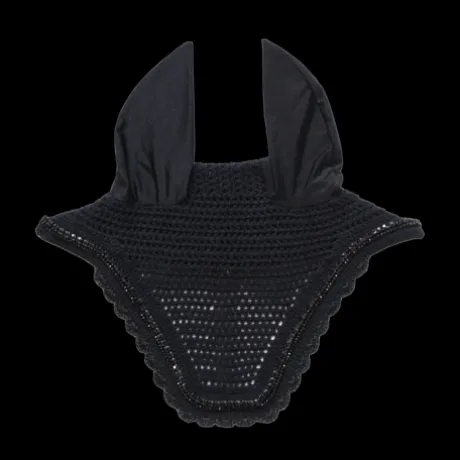 Notre Fly Veil Stone & Pearl combine le look américain moderne et l’expertise de Kentucky Horsewear. Ce bonnet est crocheté à la main pour une meilleure durabilité. Il possède un pourtour en strass et perles. Le tissu autour des oreilles est extensible et ajusté. Il protège les oreilles du cheval contre les mouches pendant le travail. La partie au niveau du cou est plus longue et ne peut donc pas glisser. Ce bonnet n’a pas de logo visible, le cavalier ou les sponsors peuvent donc broder leur propre logo. Lavage à la main uniquement.