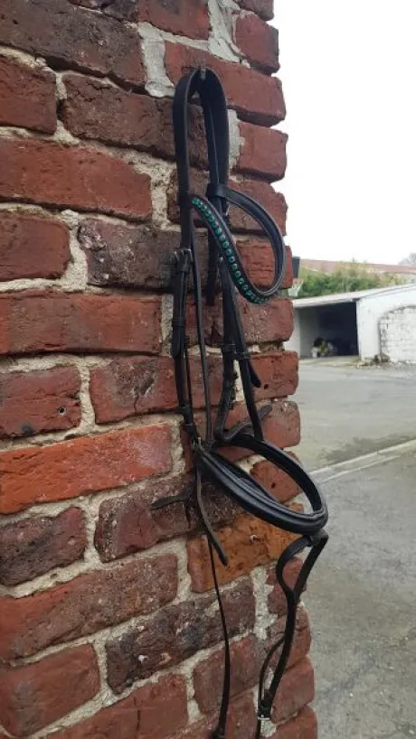 Bridon en cuir noir avec frontal vague en strass bleu turquoise taille cheval en très bon état
