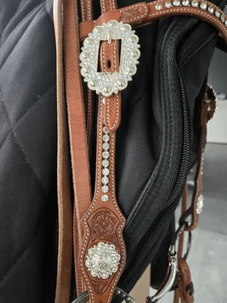 Bridon de show western de couleur chestnut avec flower tooling et boucles avec strass. Split reins.