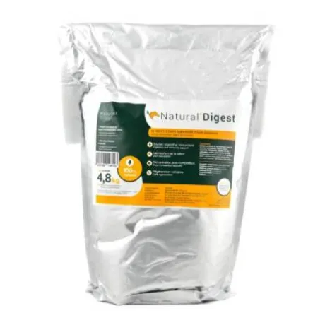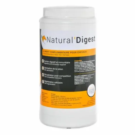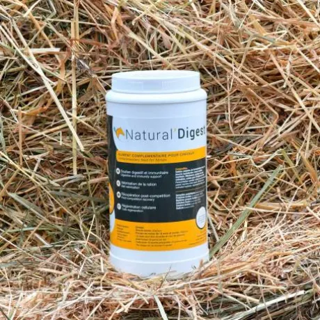 Natural’Digest est une source 100% naturelle de prébiotiques spécifiques et d’algues qui permet de soutenir la flore intestinale du cheval, sous forme de granulés en pot d’1,2 kg et en sac de 4,8 kg.
