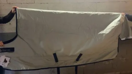 La couverture Bucas Power Turnout est dotée d’un revêtement intérieur en aluminium réfléchissant la chaleur et d’un revêtement extérieur en argent réfléchissant le soleil, ce qui élargit la plage de température d’utilisation. Elle est également dotée d’une doublure Stay-dry, antibactérienne, ce qui signifie que la couverture peut être mise sur un cheval mouillé de la même manière qu’une couverture séchante.