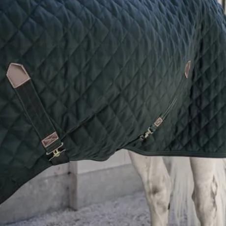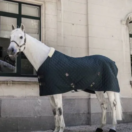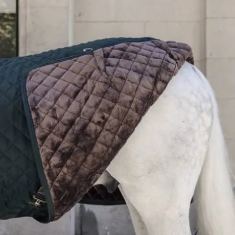 Cette couverture d’écurie avec un matelassage de 400g possède un revêtement en peau de lapin synthétique, offrant une sensation douce au contact de la peau. Cela permet également de prévenir des frottements et de l’accroche des poils dans le tissu. Grâce à son intérieur aux poils très doux, la robe des chevaux devient plus brillante et se lustre naturellement. De plus, cette peau synthétique crée de minuscules poches d’air qui enferment et retiennent la chaleur corporelle. En raison de son rapport poids/chaleur élevé, cette couverture offre un confort incomparable. Le mouton synthétique protège également le garrot. Le tissu extérieur (polyester 600D haute densité) avec son motif diamant matelassé empêche le cheval de le mordre et le déchirer. La couverture d’écurie comporte une double fermeture au poitrail et deux sursangles croisées renforcées à leurs extrémités avec du similicuir. La courroie de queue est amovible et recouverte par du plastique, permettant un entretien aisé. La couverture est également lavable en machine à 30°C (pas de sèche-linge).