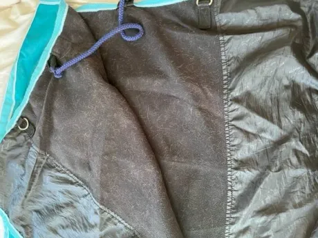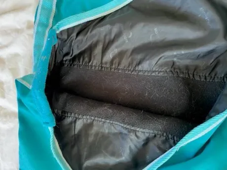 En synthétique bleu turquoise, doublée polaire noire.