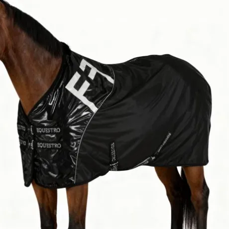 - La couverture de box en tissu gaufré doux avec insert en polyester décoré d’un logo Equestro contrasté, offre une solution innovante pour le confort de votre cheval.