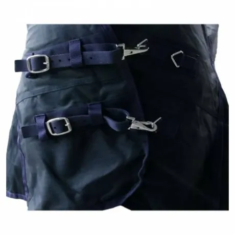 Équipée de deux sursangles croisées, de sangles de cuisses et d’une fermeture poitrail sécurisée, la couverture reste parfaitement en place, même lorsque le cheval se roule ou se déplace activement. Chaque attache est pensée pour une utilisation simple et rapide.