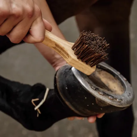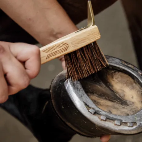 Ce cure-pieds verni en bois d’hévéa est parfait pour nettoyer les sabots de votre cheval ! Nous avons ajouté une petite brosse d’un côté, avec des fibres en polypropylène très résistants. Cela en fait une brosse très dure, idéale pour retirer le sable et la saleté des sabots de votre cheval. Le cure-pieds a deux grips et une forme anatomique. Nettoyez la brosse en la trempant dans l’eau chaude savonneuse et soyez certain de la garder pendant longtemps.