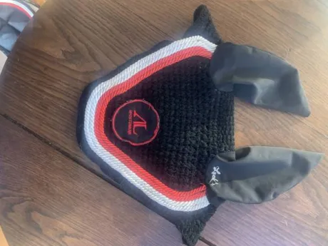 Je vends cette ensemble tapis + bonnets Alexandra ledermann de couleur noir avec cordons rouge et blanc.