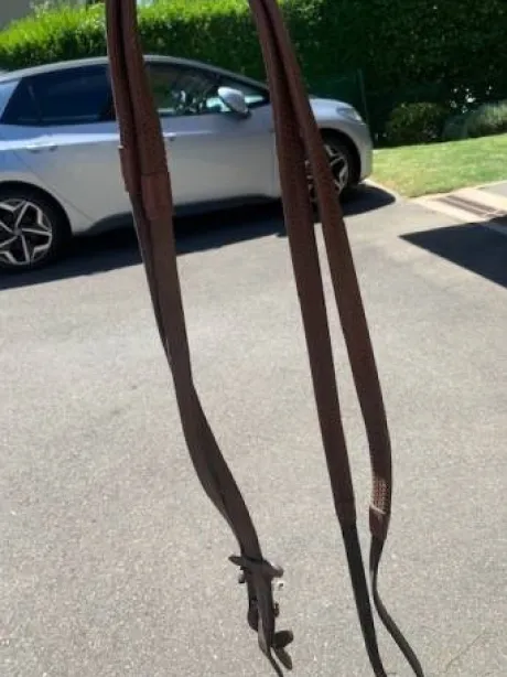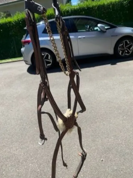 Filet muserole croisé marron avec reines en caoutchouc, bon état, taille poney