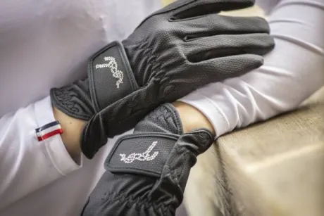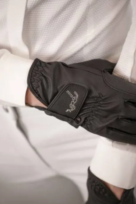 Gants d’équitation Prisma Strass Pénélope très fin et agréable à porter dotés du logo Pénélope en strass sur la patte de fermeture en scratch.