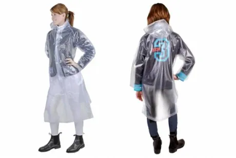 Cette longue veste de pluie de la marque HKM est imperméable et transparente.