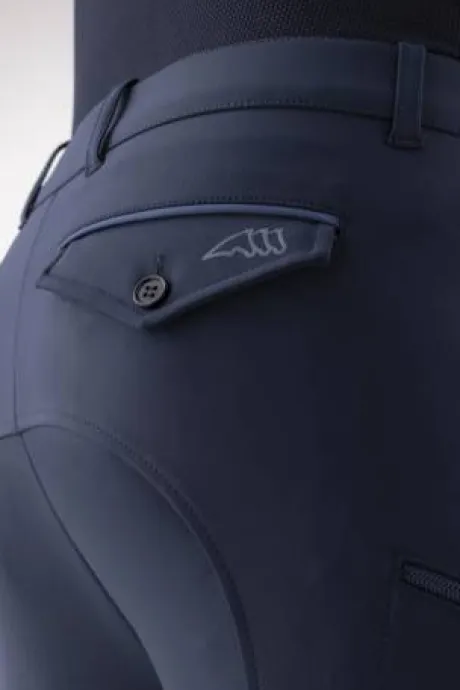 - Le passepoil de couleur contrastée des poches arrière ajoute une touche de style, tandis que le logo imprimé sur la poche arrière droite est le gage de la qualité Equiline.