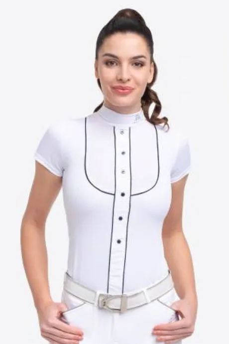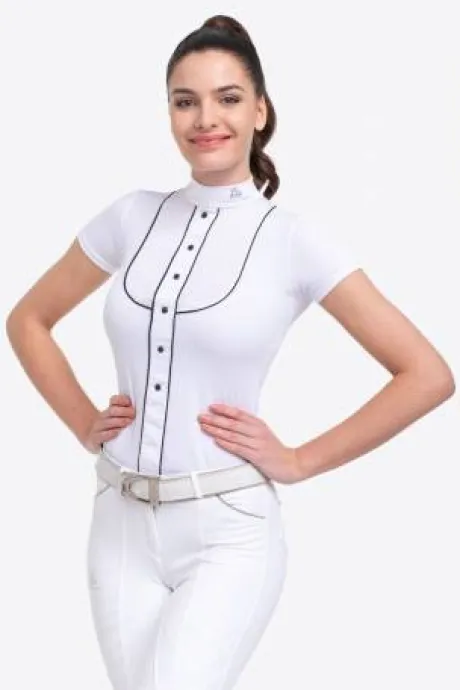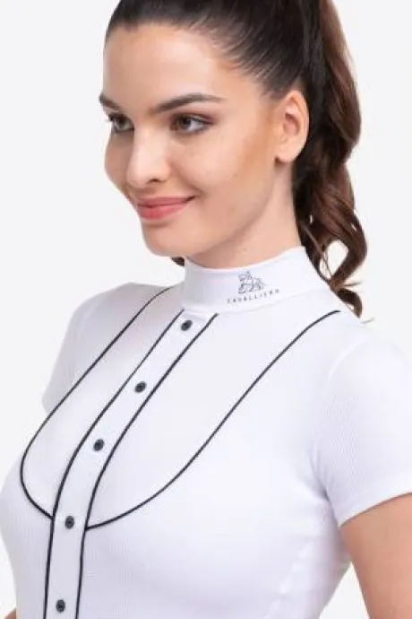 Découvrez le polo de concours équestre GENTLE RIVER de la marque Cavalliera, un choix idéal pour les cavalières en quête d’un vêtement à la fois technique et stylé. Conçu avec des tissus respirants et légers, ce haut de compétition offre une grande élégance tout en garantissant un confort optimal lors de vos performances.