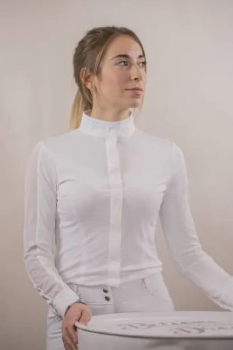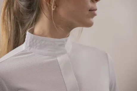 Polo de concours Las Honey confectionné dans un tissu blanc alvéolé léger, respirant . Il est composé d’un col officier rehaussé de délicates surpiqûres ton sur ton et d’un plastron ton sur ton qui se ferme par un rang de bouton cachés par une patte. Sur la manche longue gauche le logo Pénélope apparait dans une matière type gomme. Chic et technique, il se porte facilement en concours hippiques pour un look sobre et efficace.