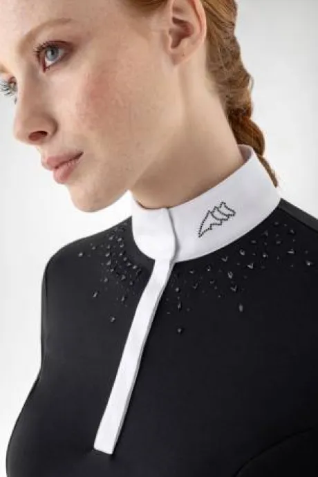 Doté d’un col avec bouton-pression cachée pour un look élégant, il est orné d’un logo de strass argenté sur le col et d’un design orné de strass noir sur la poitrine.