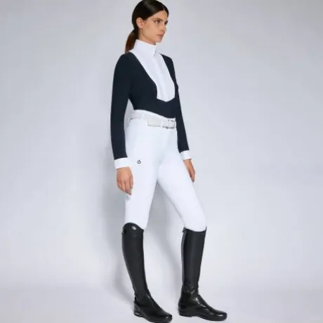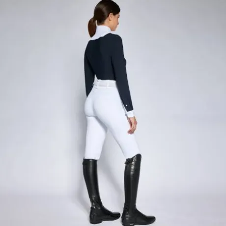 Le polo Hunter à manches longues pour femme présente un col montant en popeline et un plastron avec des détails plissés et des boutons cachés.