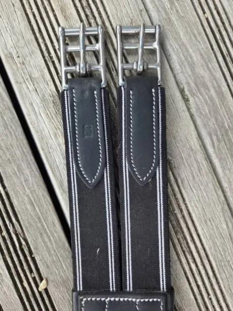 Sangle QHP anatomique avec surpiqûres blanches avec élastiques des deux côtés en cuir noir. Rembourée pour plus de confort. 3 anneaux, un en dessous et un de chaque côté pour les enrènements