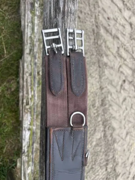 Sangle en très bon état malgré l’utilisation fréquente auparavant. une légère usure sur le centre (griffure de fer) à voir sur la photo. élastiques et sanglons intactes
