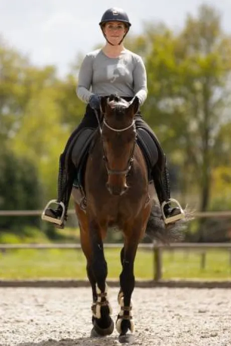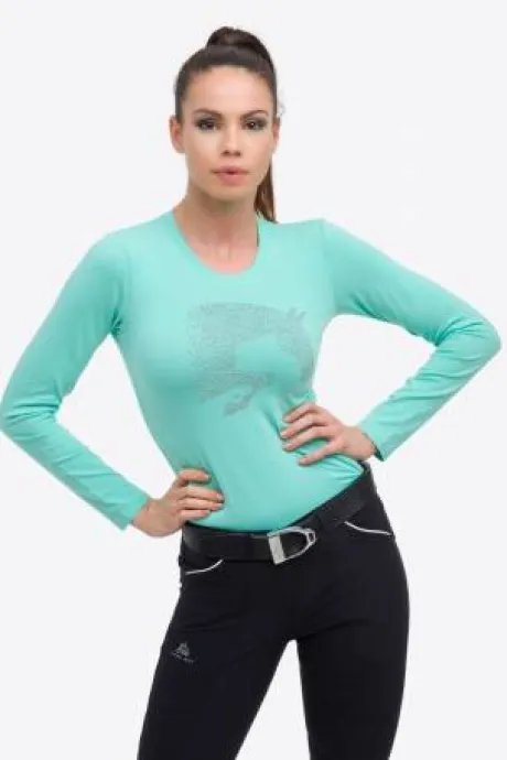 Ce t-shirt en coton doux est conçu pour la femme passionnée par les chevaux, offrant une silhouette élégante et confortable. Les fibres naturelles conservent leur forme tout en créant un style flatteur et incroyablement doux qui se drape délicatement sur votre corps. Avec son col rond et ses manches courtes, il est orné d’une décoration en cristaux représentant un cheval en saut, ajoutant une touche raffinée à votre tenue. Que ce soit pour afficher votre discipline équestre ou simplement pour exprimer votre amour des chevaux, ce haut est idéal après une journée bien remplie dans le manège.