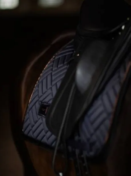 Tapis de selle élégant avec des surpiqures modernes en bleu nuit foncé avec des détails noirs et rosegold. Décoré du badge Equestrian Stockholm rosegold