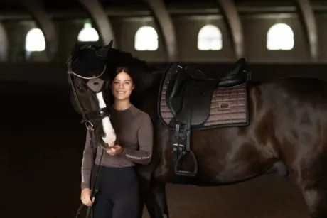 Tapis de selle sportif forme Dressage de couleur marron mocha. Possède un insert en mesh grip noir pour que la selle reste en place. Décoré du badge Equestrian Stockholm en noir.