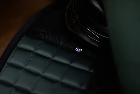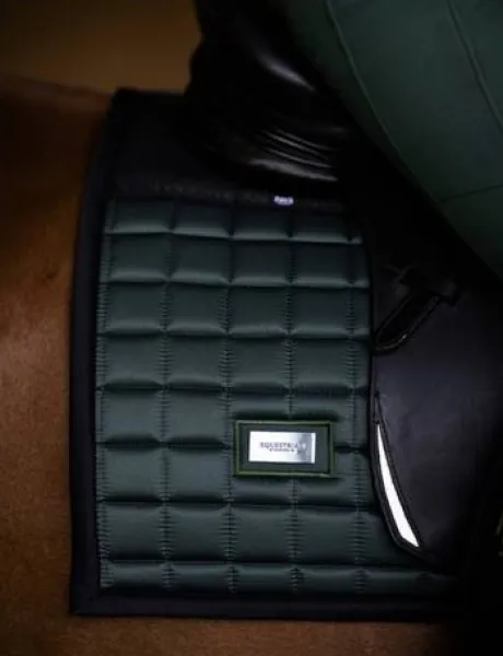 Tapis de selle au design sportif vert foncé, avec du mesh noir décoratif et un badge Equestrian Stockholm noir.