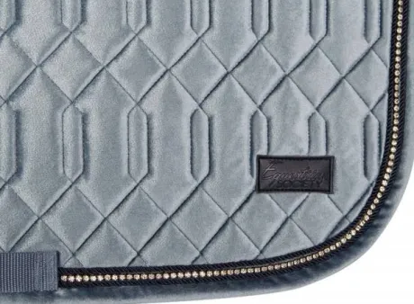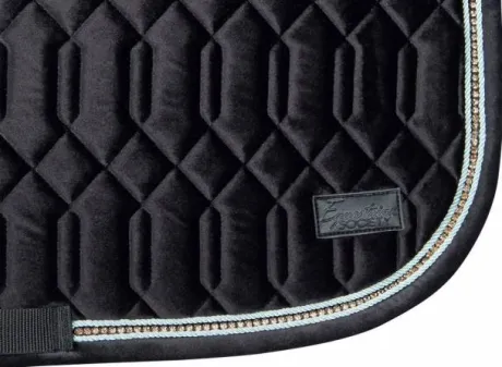 Tapis de selle avec double cordon décoratif fin et cristaux à l’arrière, écusson sur le côté gauche, passants pour selle et sangle.