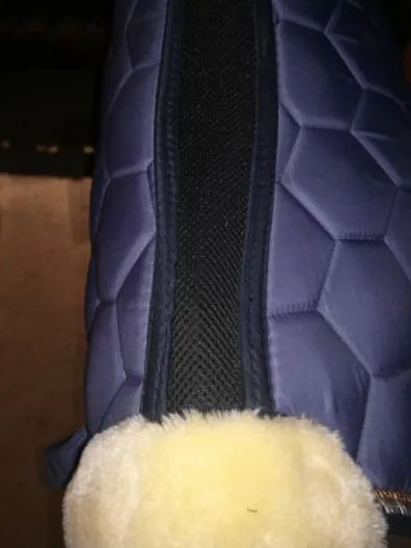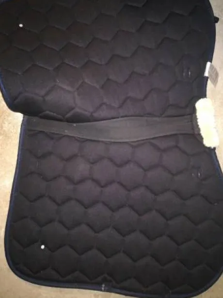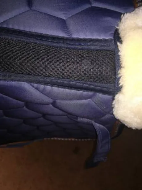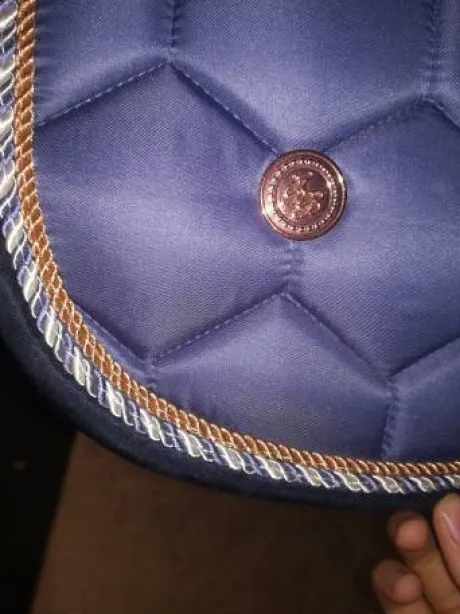 Vente de ce tapis car trop petit maintenant que jepasse a cheval. Ila un logo rose gold avec la bordure rose dorée et violet Lola. Les passants de sangles sont en scratch et motif octogonales. Au niveau du garrot de la moumoute (faux mouton évidement). Mis deux fois puis lavés.