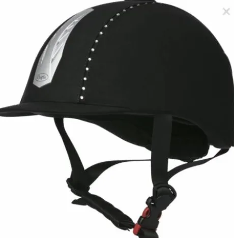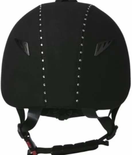 Coque velours noir, bordures de zone médiane incrustées de strass transparents, aération frontale coloris argenté mat. Elle offre une excellente ventilation, et un grand confort au cavalier. Protections de menton et de molette de réglage capitonnées.