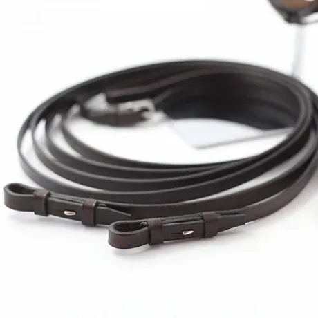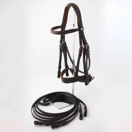 Cette bride est vendue avec 2 paires de rênes en cuir (largeur 20 mm et 16 mm longueur entre 1350 et 1450 mm)