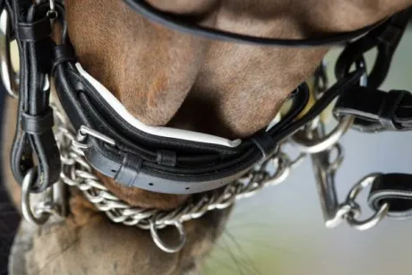 - Muserolle pull-back de 3 cm avec découpe anatomique, laquée, rembourrée et doublée de cuir souple