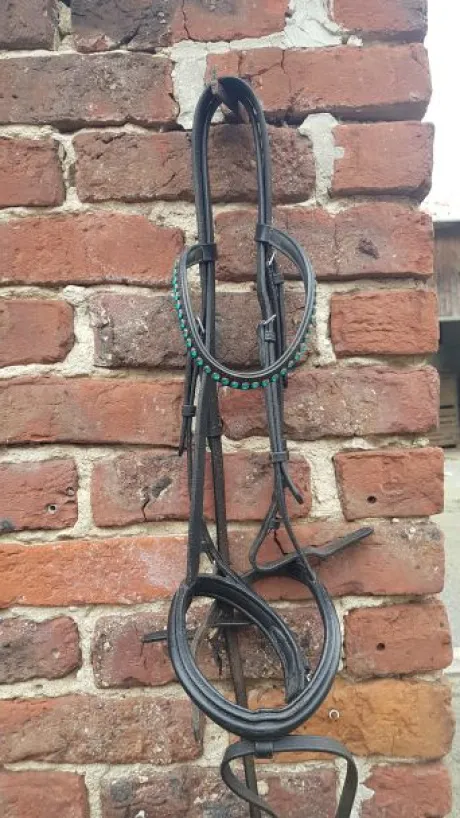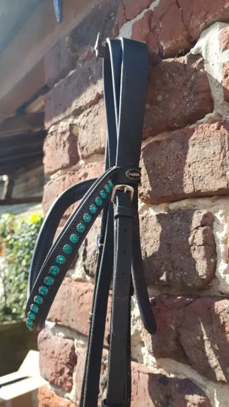 Bridon en cuir noir avec frontal vague en strass bleu turquoise taille cheval en très bon état