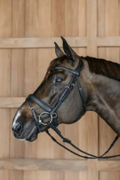Ce bridon est équipé d’une muserolle médium élégante avec un noseband détachable de ½ ». La muserolle est large de 30 mm, ce qui répartit mieux la pression et est plus confortable pour votre cheval. Le bridon est doté d’un pull back et d’un frontal anatomique en forme de V. Les oreilles du cheval sont libres de bouger grâce à la têtière en forme de S.