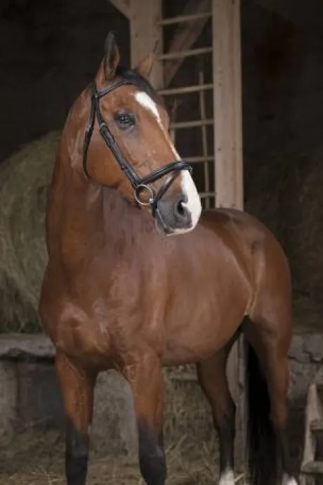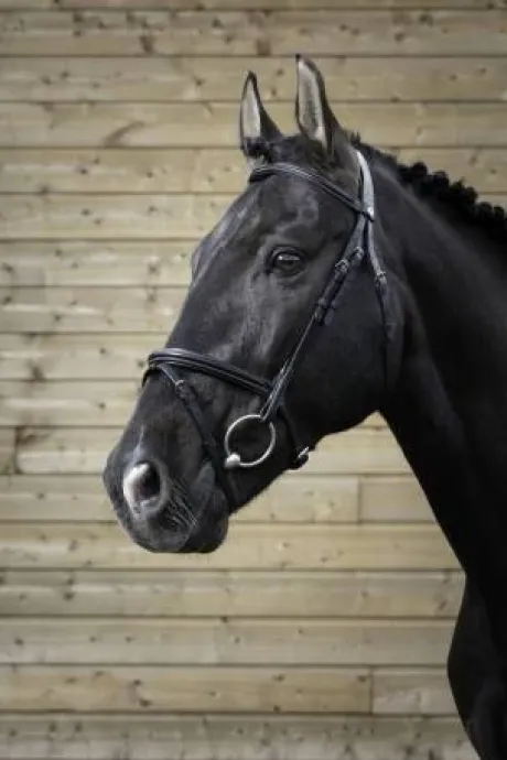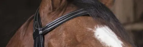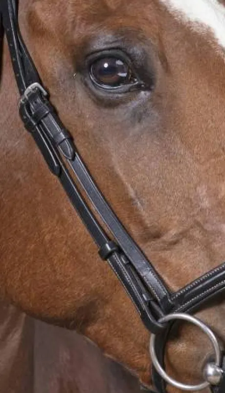- Têtière découpée, frontal et muserolle combinée doublés cuir vachette, coutures blanches, crochets sur les montants de mors.