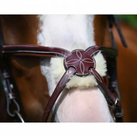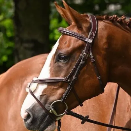 - Son frontal et sa muserolle sont surmontés par un cuir carré surpiqué en blanc, apportant une touche d’élégance.