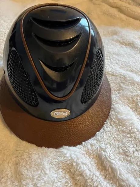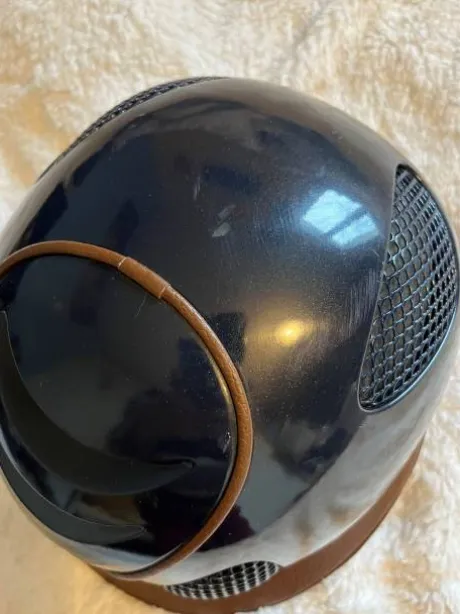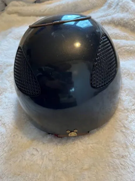 couleur : bleu marine brillant pailleté – visière, bordure et sangle cuir marron