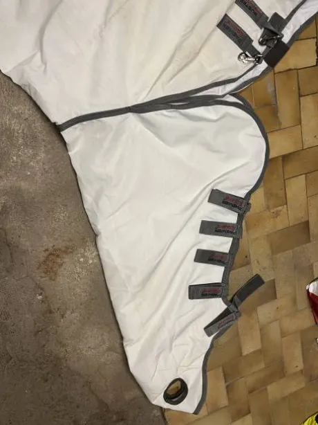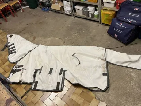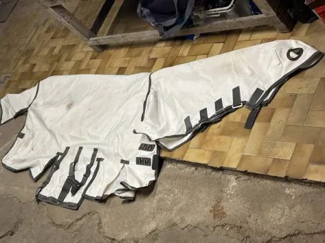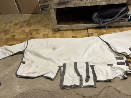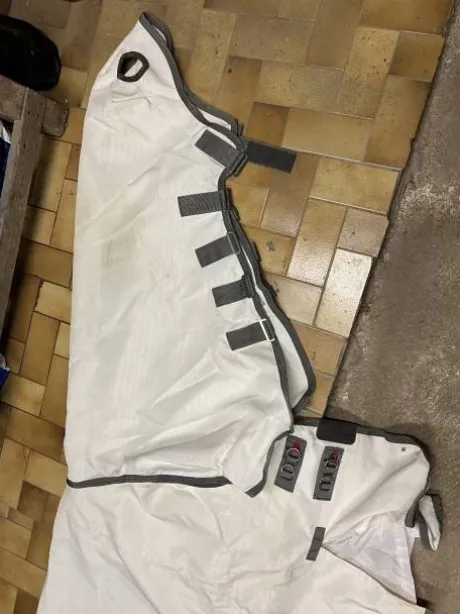 Couverture anti mouche et son couvre cou (fixe) avec trou d’oreilles, taille 145 portée 3 fois par mon cheval, elle a des taches mais aucun accro