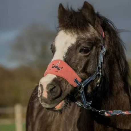 - Doublure en polaire rose et ajustements possibles au niveau de la muserolle et des deux côtés de la têtière