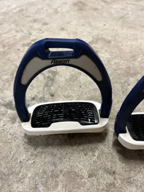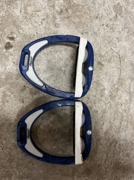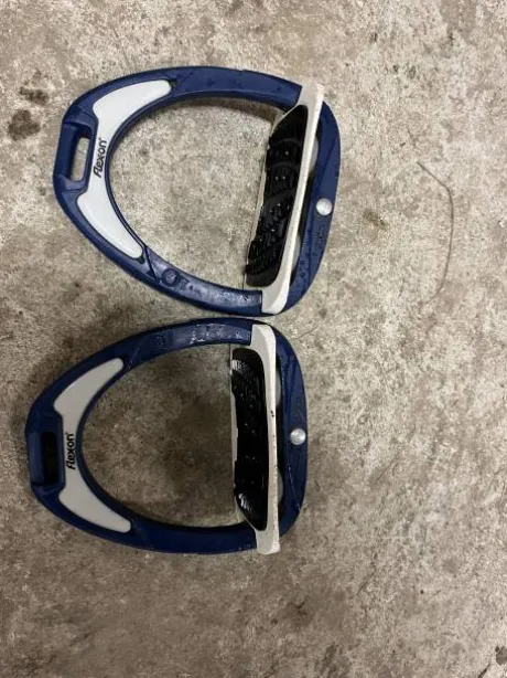 Étriers flexon junior bleu, blanc et gris très bon état. Les grippes ont été changé il y a 3 mois ils sont intactes.