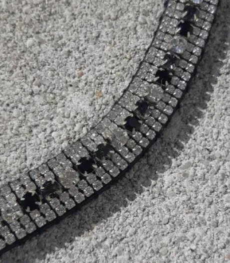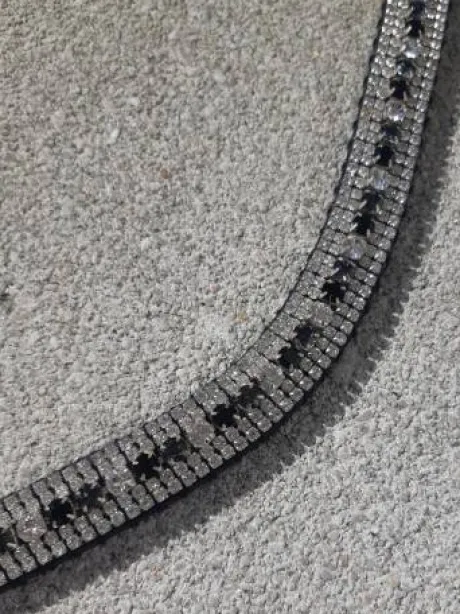 Deux rangées de strass fins blanc, une rangée de gros strass blanc, gris et noir, puis à nouveau deux rangées de strass fins blanc.