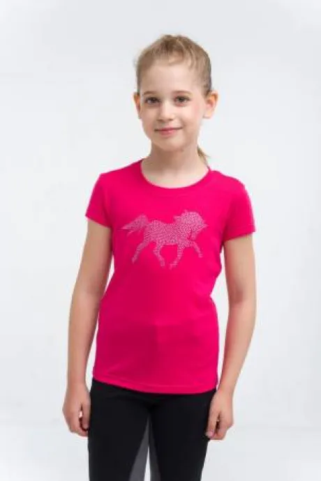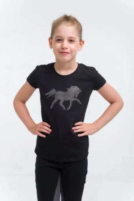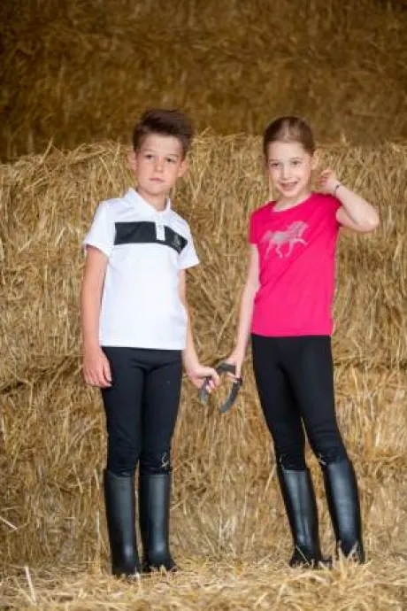 Ce tee-shirt à base de coton, orné de petits cristaux, est conçu spécialement pour les jeunes cavalières, que ce soit pour les activités équestres ou pour une sortie en ville. Avec son grand motif en strass représentant un tendre poulain, il s’associe parfaitement avec un pantalon d’équitation ou un jean. Le tissu en lycra extensible dans les quatre sens assure un confort optimal tout en conservant sa forme après lavage. Ce haut est un incontournable pour la garde-robe de toute jeune cavalière. Disponible en manches courtes et longues, il se distingue par son style pratique et élégant.