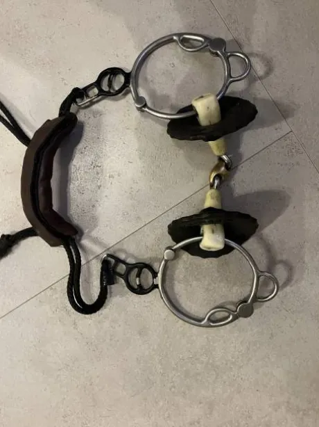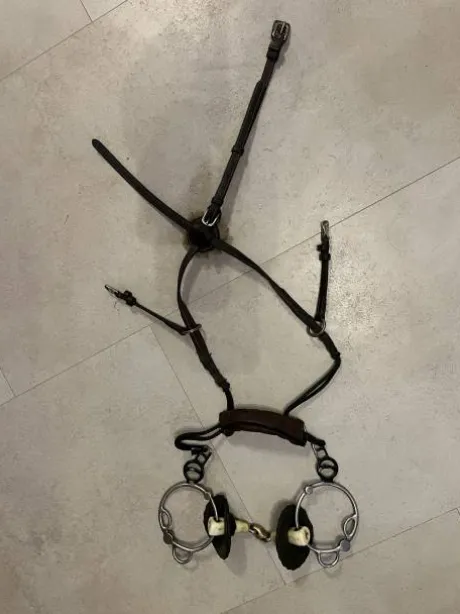 Mors Alain ventre acheté en 2021 taille 130 avec des rondelles en gel ce qui peut convenir à une bouche plus petite. Bon état vendu avec une muserolle croisée Dion couleur havane.