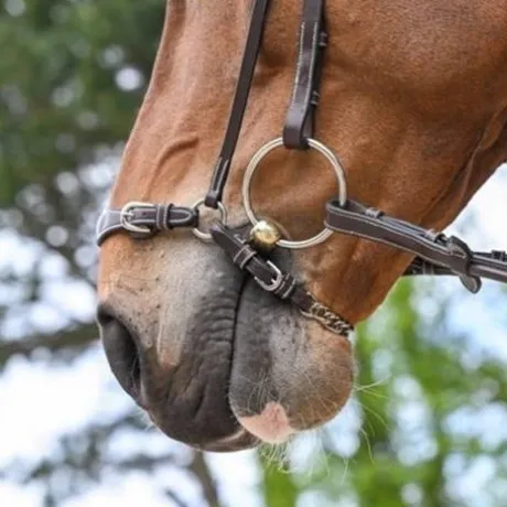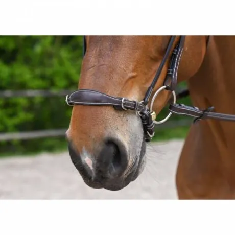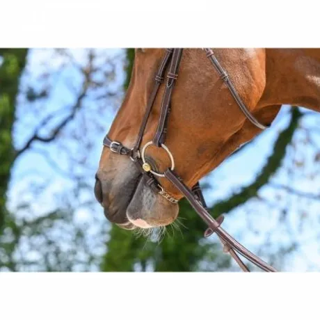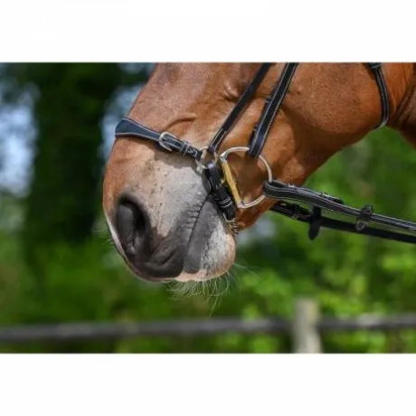 Muserolle allemande en cuir haut de gamme composée de deux montants qui s’adaptent à tous les bridons Jump’In. La partie supérieure de la muserolle est composée de deux petites boucles qui permettent de préciser le serrage. La partie inférieure est composée d’une chaîne appelée gourmette qui permet un plus grand impact sur le cheval mais aussi de la régler avec encore plus de précision. La muserolle allemande est utilisée pour des chevaux ouvrant la bouche et ayant du mal à se fixer sur la main du cavalier.