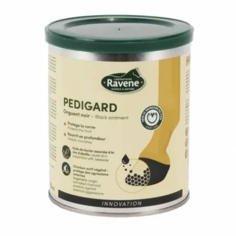 Grâce au charbon actif végétal qu’il contient, le Onguent noir pour sabots Ravene Pedigard garantit une protection efficace du sabot du cheval contre les agressions externes .