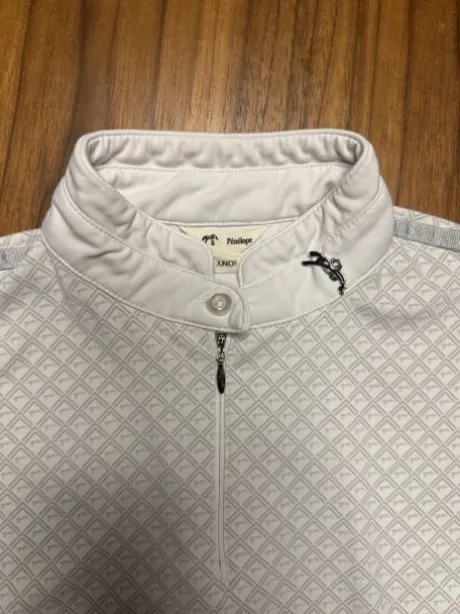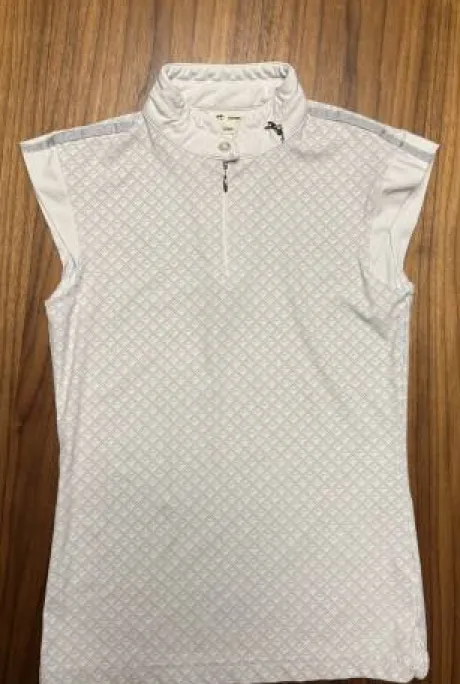 Polo de concours manche courte Pénélope, gris et blanc, avec un imprimer du logo sur toute la surface du polo