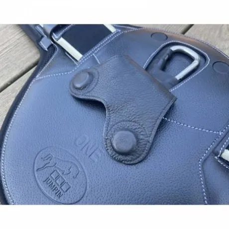 - Mousqueton central pour fixer les enrênements et rabat en cuir aimanté pour plus de sécurité