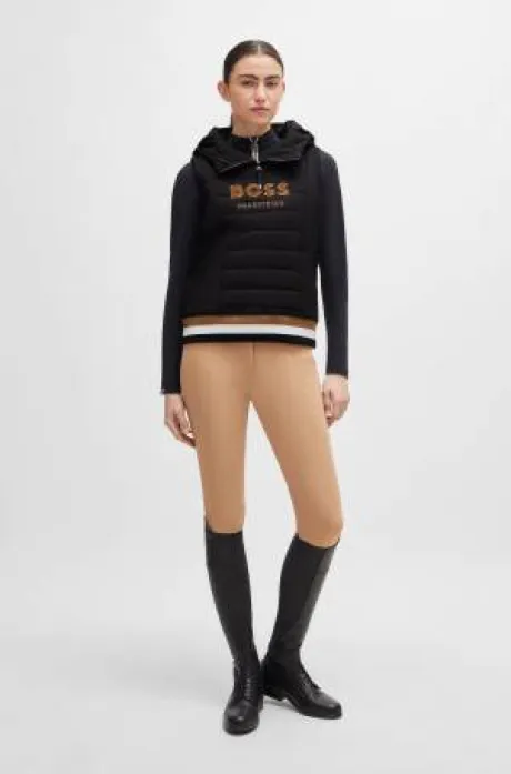 Pull à capuche sans manches avec grande broderie BOSS Equestrian sur le devant, rembourrage à l’intérieur et bande rayée à l’intérieur de la capuche, fermeture éclair courte avec tirette en silicone. Ourlet du bas en élastique tricolore.